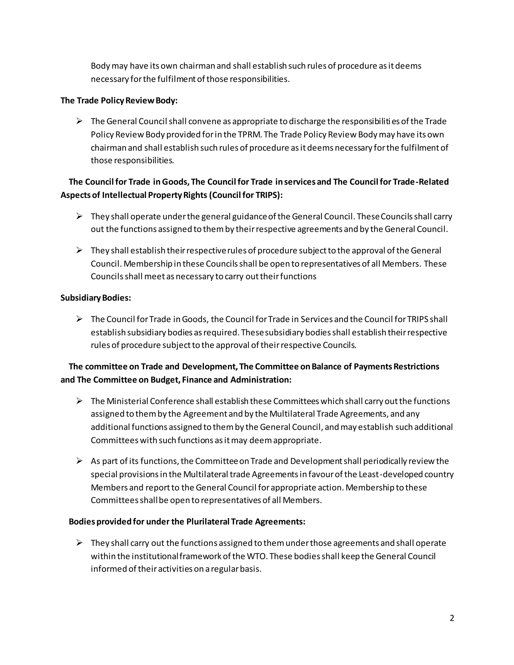 - Specialized councils manage agreements on goods, services, intellectual property, and other issues.