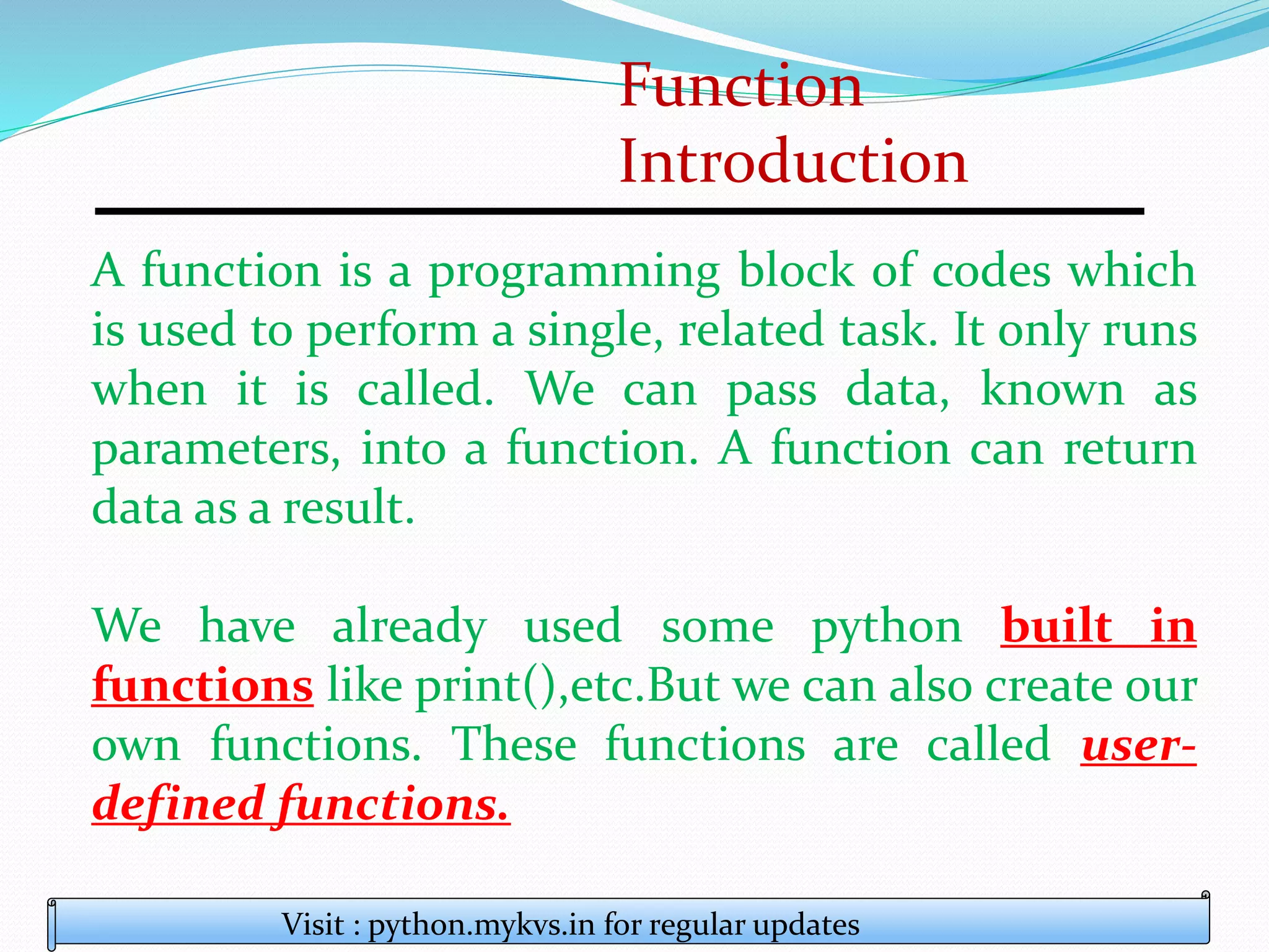 The document discusses functions in Python. It defines a function as a block of code that performs a specific task and only runs when called. There are three types of functions: built-in functions, functions defined in modules, and user-defined functions. Functions can take parameters and return values. Variables used in functions can have local, global, or nonlocal scope. Functions allow for code reusability and modularity.