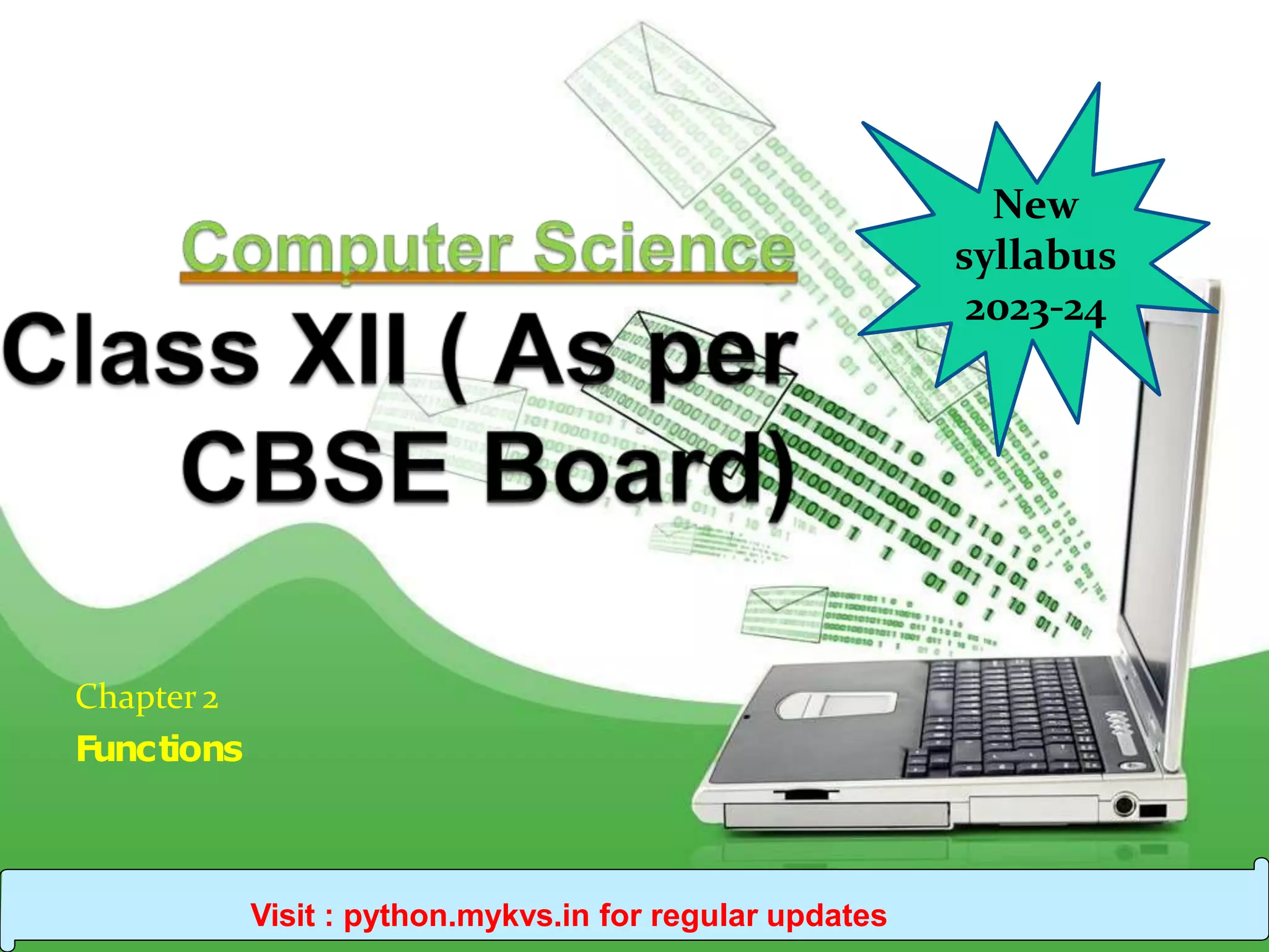 3). User definedfunction: Functions that we define ourselves to do certain specific task are referred as user-defined functions because these are not already available. Visit : python.mykvs.in for regularupdates