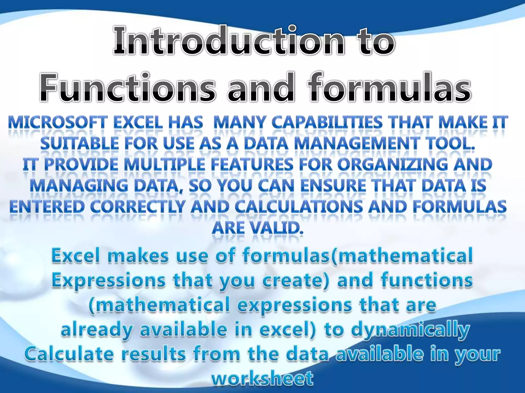 1. Functions simplify formulas in Excel by performing calculations using cell references and predefined operations, rather than manually typing operations. Common functions include SUM, AVERAGE, MAX, and MIN.