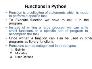 This document discusses functions in Python. It defines functions as collections of statements that perform specific tasks. There are three types of functions: built-in functions, module functions, and user-defined functions. Built-in functions are predefined in Python, module functions are contained in .py files, and user-defined functions are created by the user. The document provides examples of various types of functions and how they can be called and used.