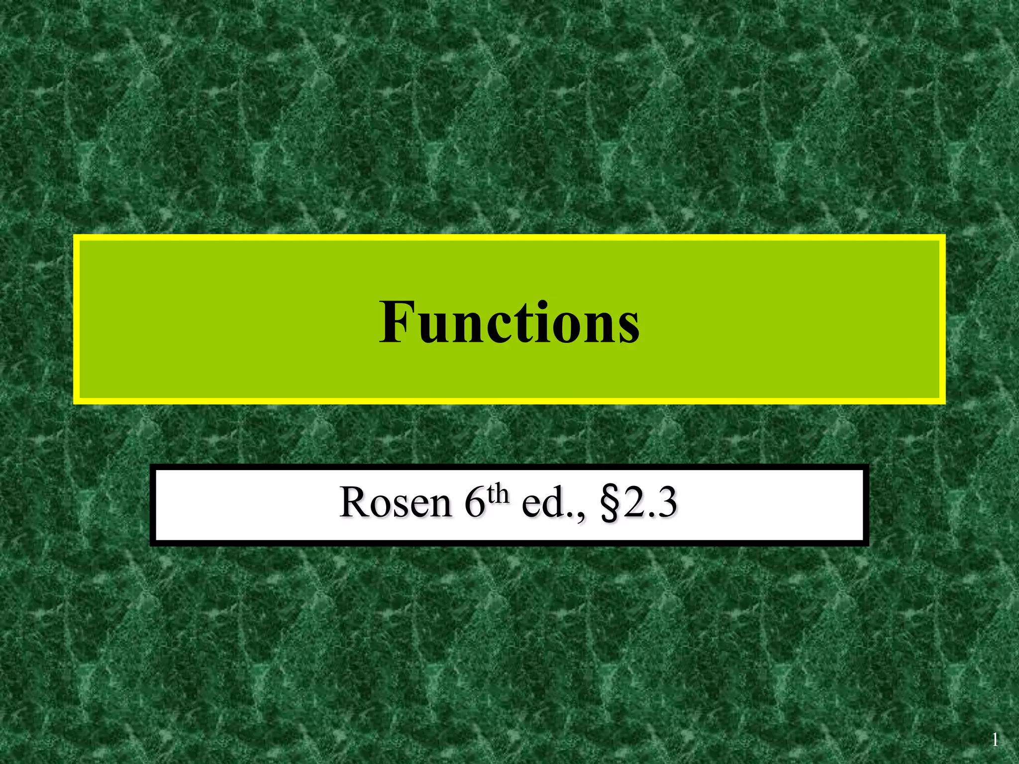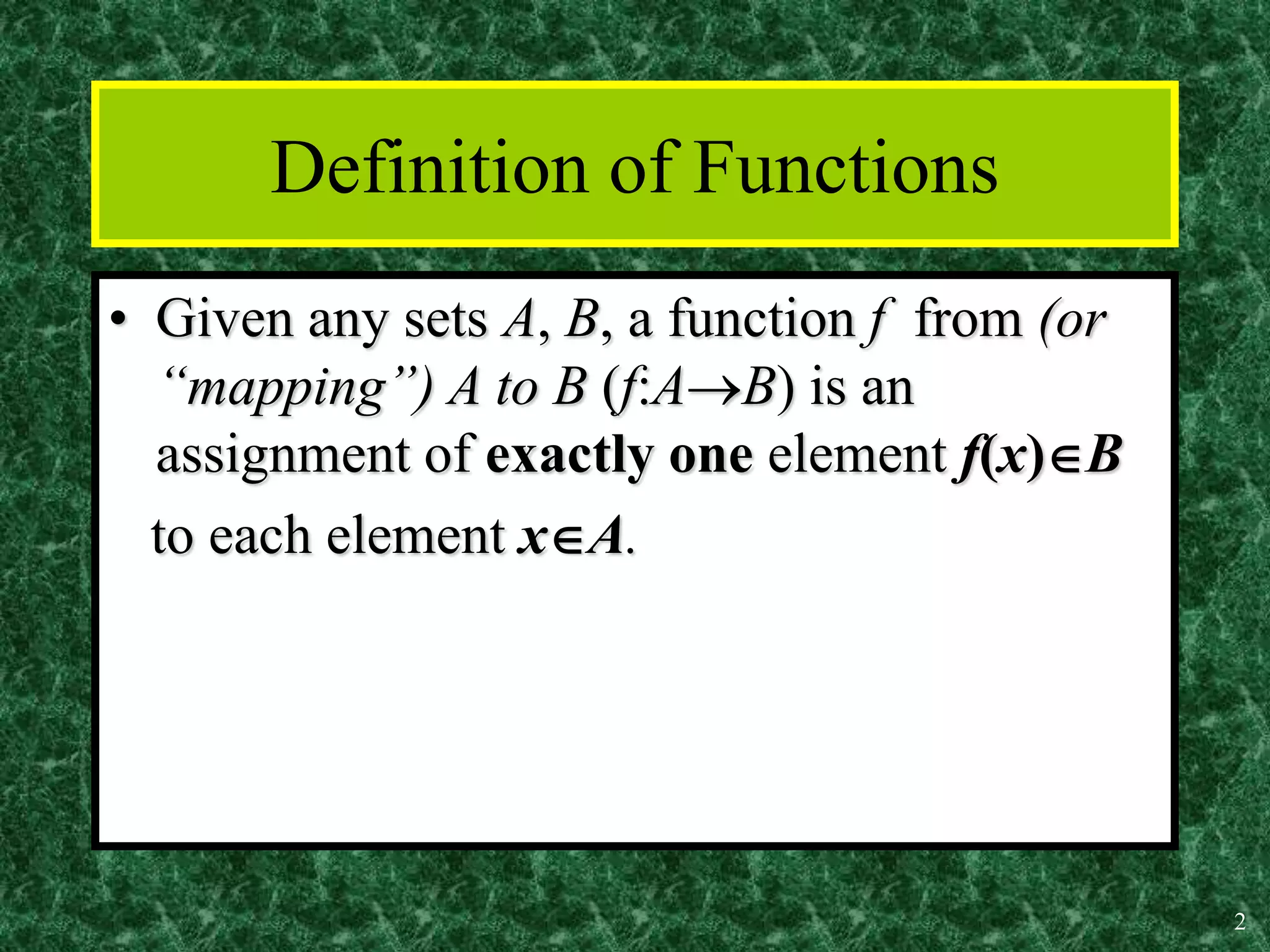 1. A function is a mapping or assignment of elements from one set (the domain) to elements in another set (the codomain or range) such that each element of the domain is mapped to exactly one element of the codomain. Functions can be represented graphically.