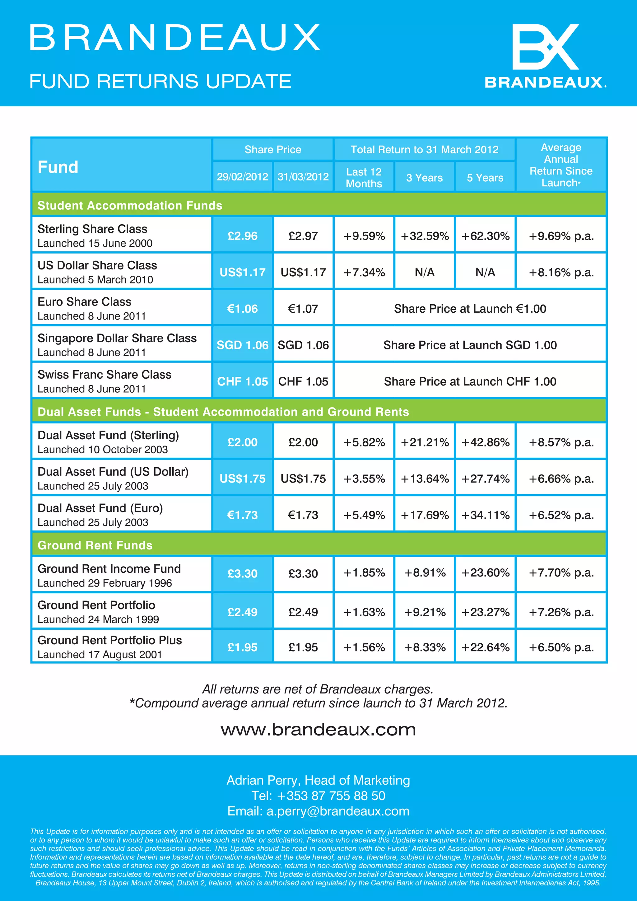 The document provides an update on the fund returns for various real estate funds as of 31 March 2012. It shows the share price and total returns over the last 12 months, 3 years, 5 years, and average annual return since launch for each fund. The funds invest in student accommodation, ground rents, or a dual strategy of student accommodation and ground rents. Over the periods reported, most funds saw share price increases and positive total returns, ranging from 1.56% to 9.59% over the last 12 months and 6.5% to 9.69% average annual returns since launch.
