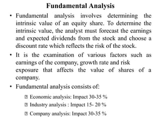 Fundamental analysis involves determining a company's intrinsic value by forecasting its future earnings and dividends. It examines factors like earnings, growth rates, and risk exposure. Fundamental analysis consists of economic (30-35%), industry (15-20%), and company (30-35%) analysis. Economic analysis considers macroeconomic factors' impact on security prices. Industry analysis examines an industry's performance, prospects, and life cycle stage. Company analysis evaluates specific factors of a business. Fundamental analysis is used to evaluate investment opportunities.