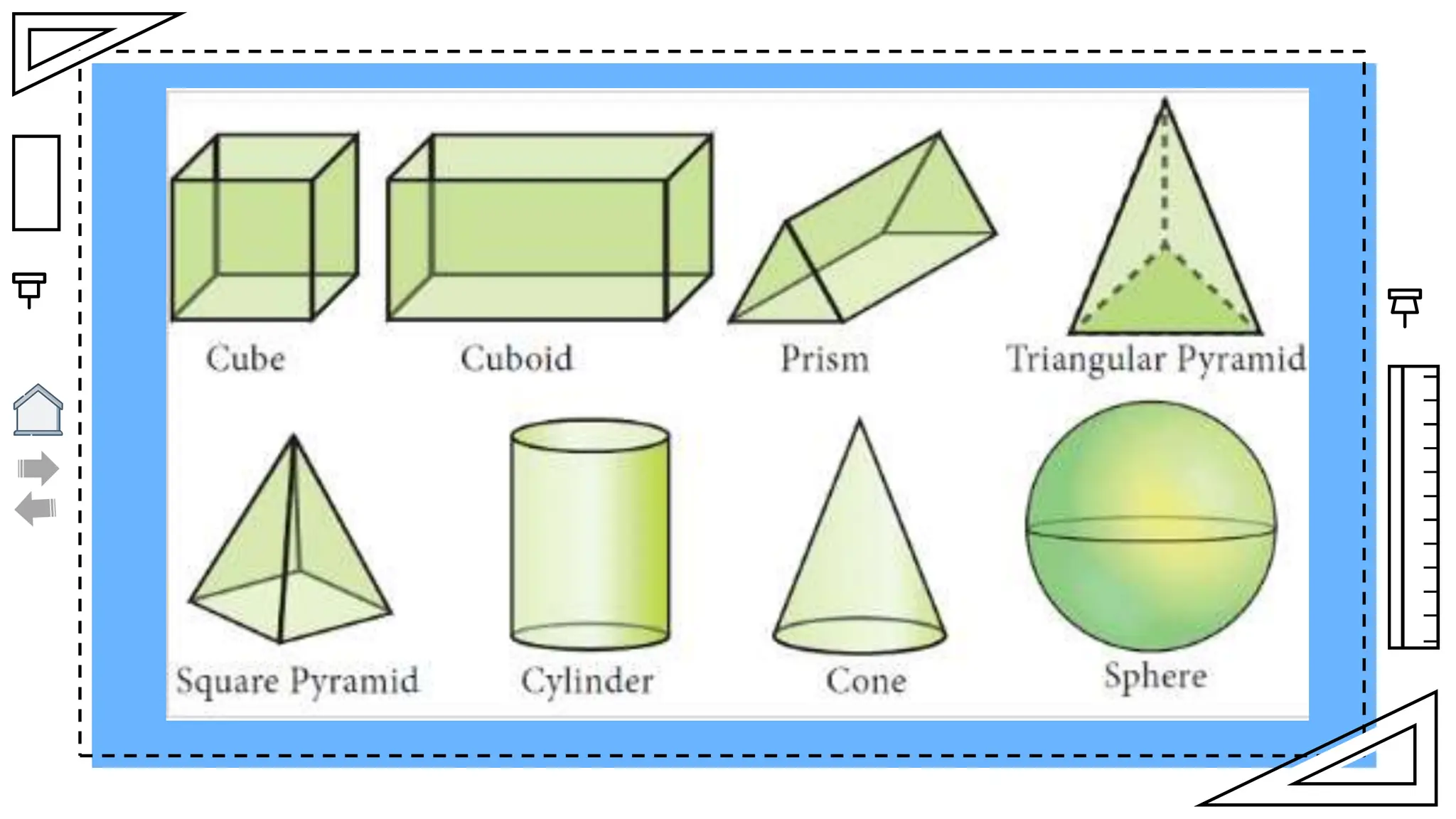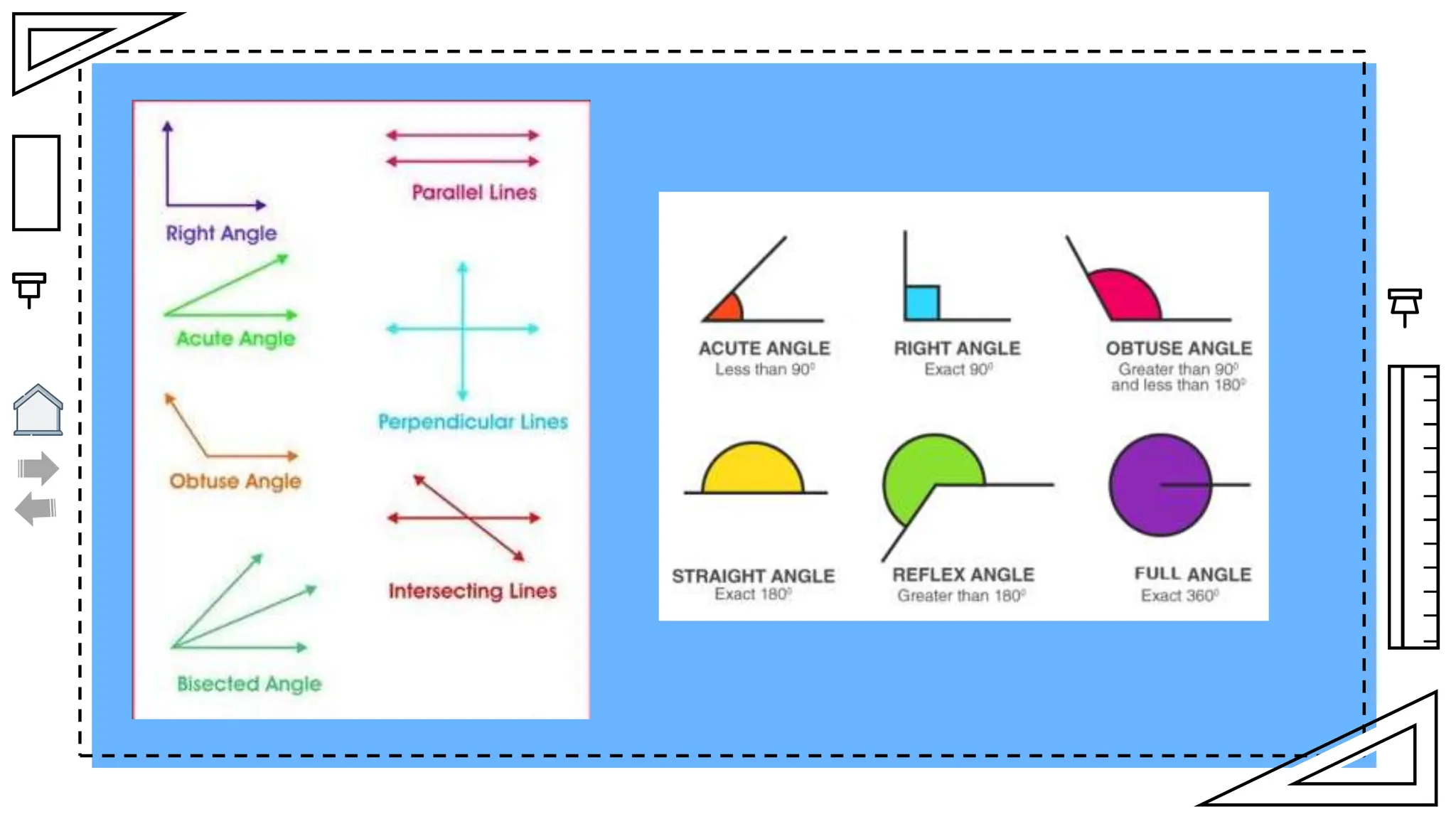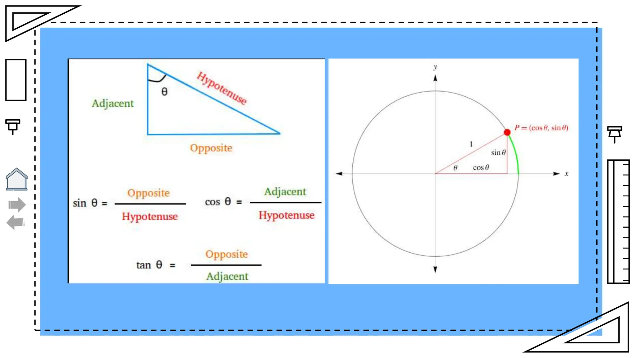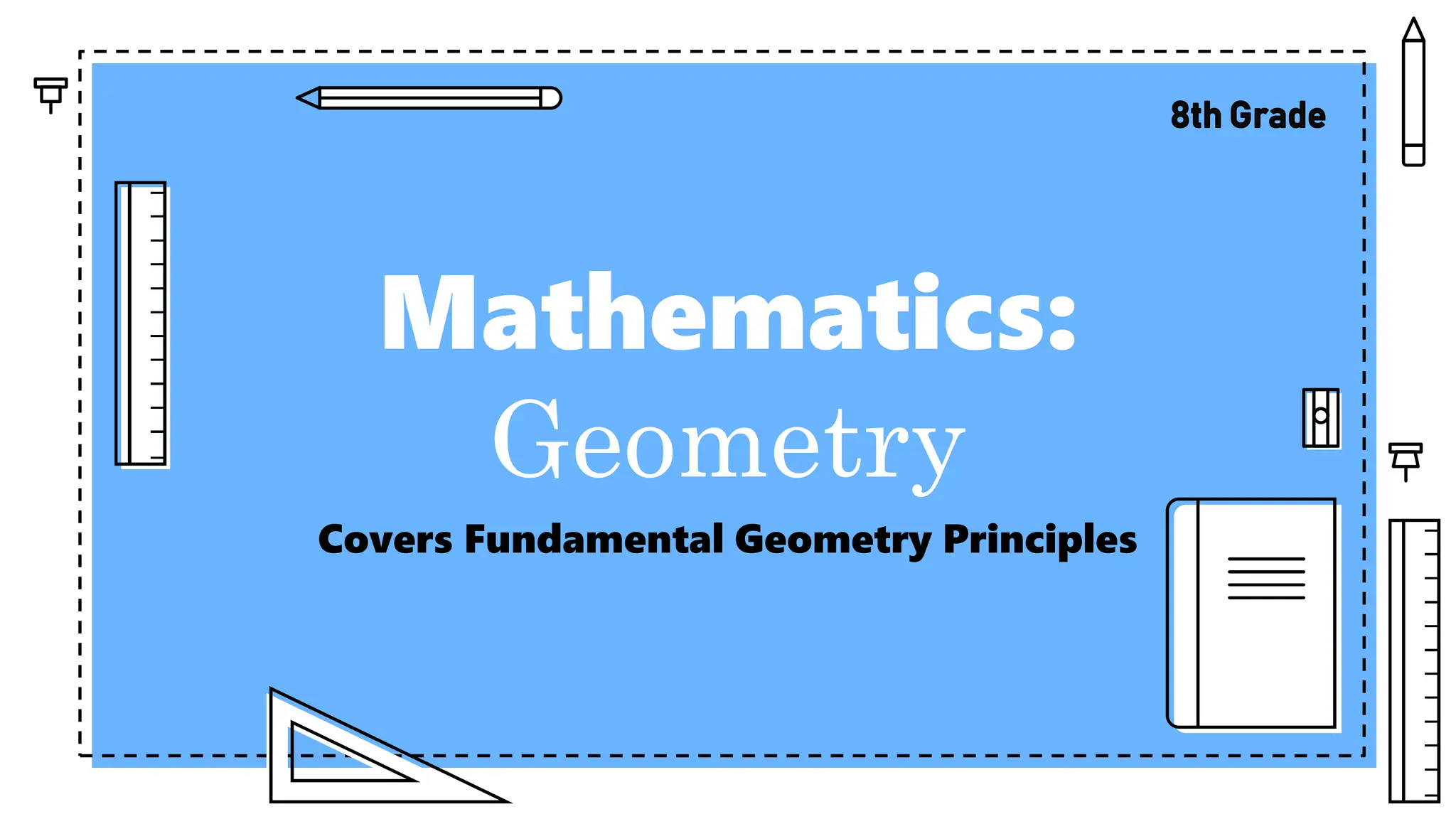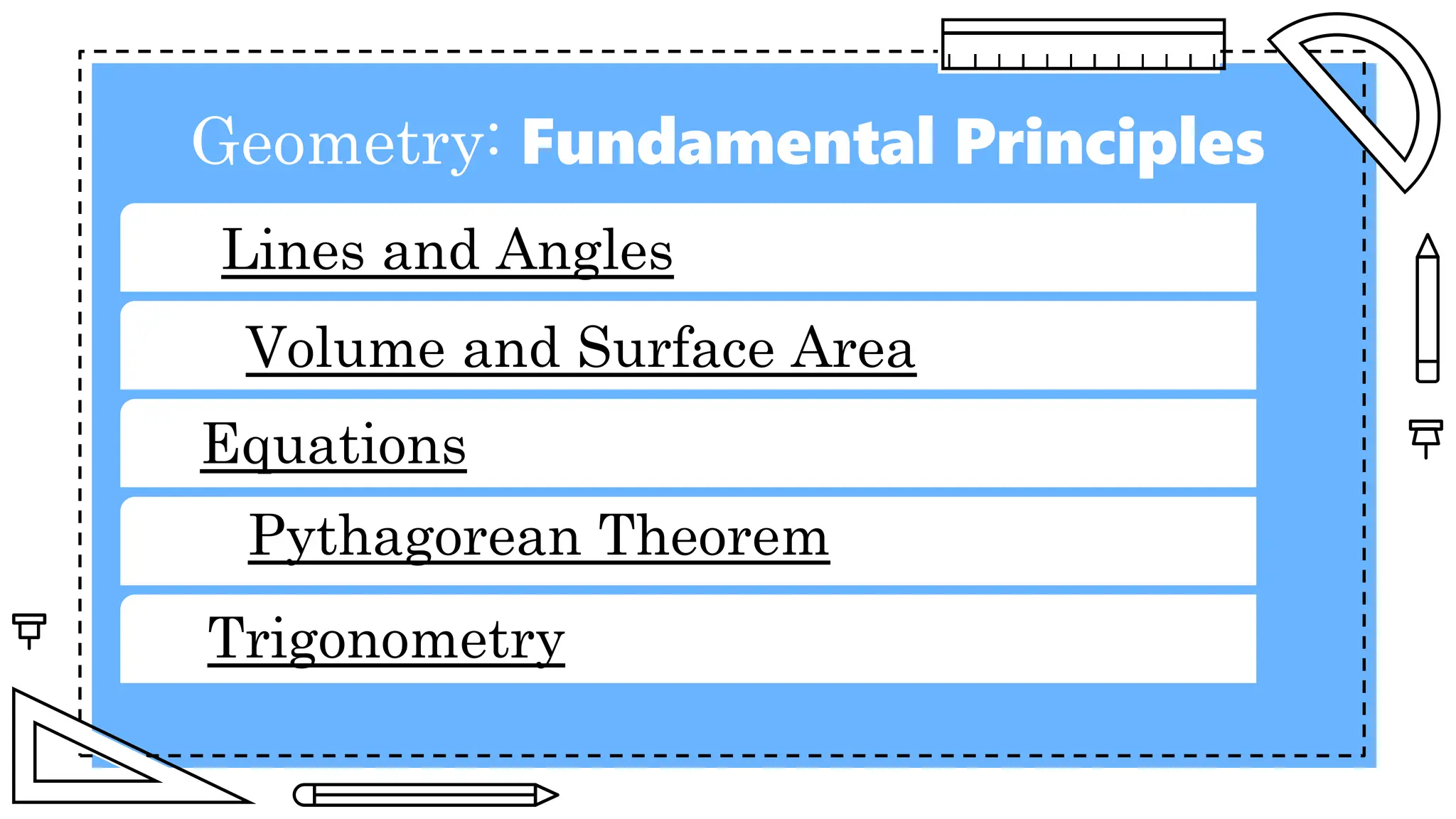 The document outlines essential principles of geometry, including concepts of lines, angles, volume, surface area, equations, and the Pythagorean theorem. It emphasizes the interrelationships of angles and sides in triangles through trigonometry, covering critical functions and applications. The information is presented with credits to various sources for images and icons used in the template.