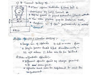This document provides information about machine tools and lathes. It discusses that machine tools are power operated machines that cut metal using cutting tools. It then describes the major components of lathes, including the headstock, spindle, tailstock, carriage, apron, and bed. It explains the different motions in machining like primary and auxiliary motion. The document also summarizes various classifications of machine tools and discusses performance criteria. Finally, it covers topics like specification, drive systems, speed changing methods, and work holding devices in lathes.