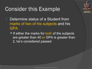 This document discusses programming fundamentals and decision making in programs. It provides examples of programs that make decisions based on conditions. The first example determines if a student passed or failed based on marks in two subjects and GPA. The second example determines if a student receives a grade of A based on total marks and GPA. Further examples are provided to determine car type based on price and engine size, and display name based on student roll number. The document concludes with tasks for readers to design programs to display city names from codes and calculate base pay from annual salary and pay type.