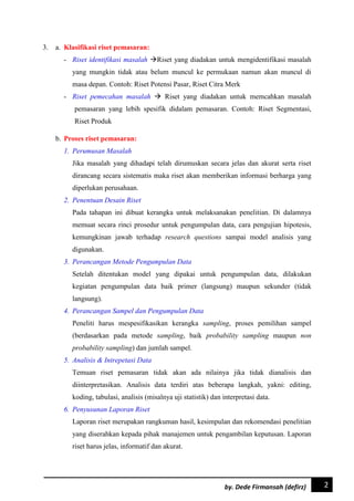 Riset pemasaran adalah proses sistematis untuk mengidentifikasi masalah dan mendukung pengambilan keputusan di bidang pemasaran. Perusahaan perlu melakukan riset pemasaran untuk mengumpulkan data akurat yang membantu dalam penyusunan strategi dan taktik. Selain itu, langkah-langkah dalam riset pemasaran mencakup perumusan masalah, desain riset, pengumpulan data, analisis, dan penyusunan laporan.