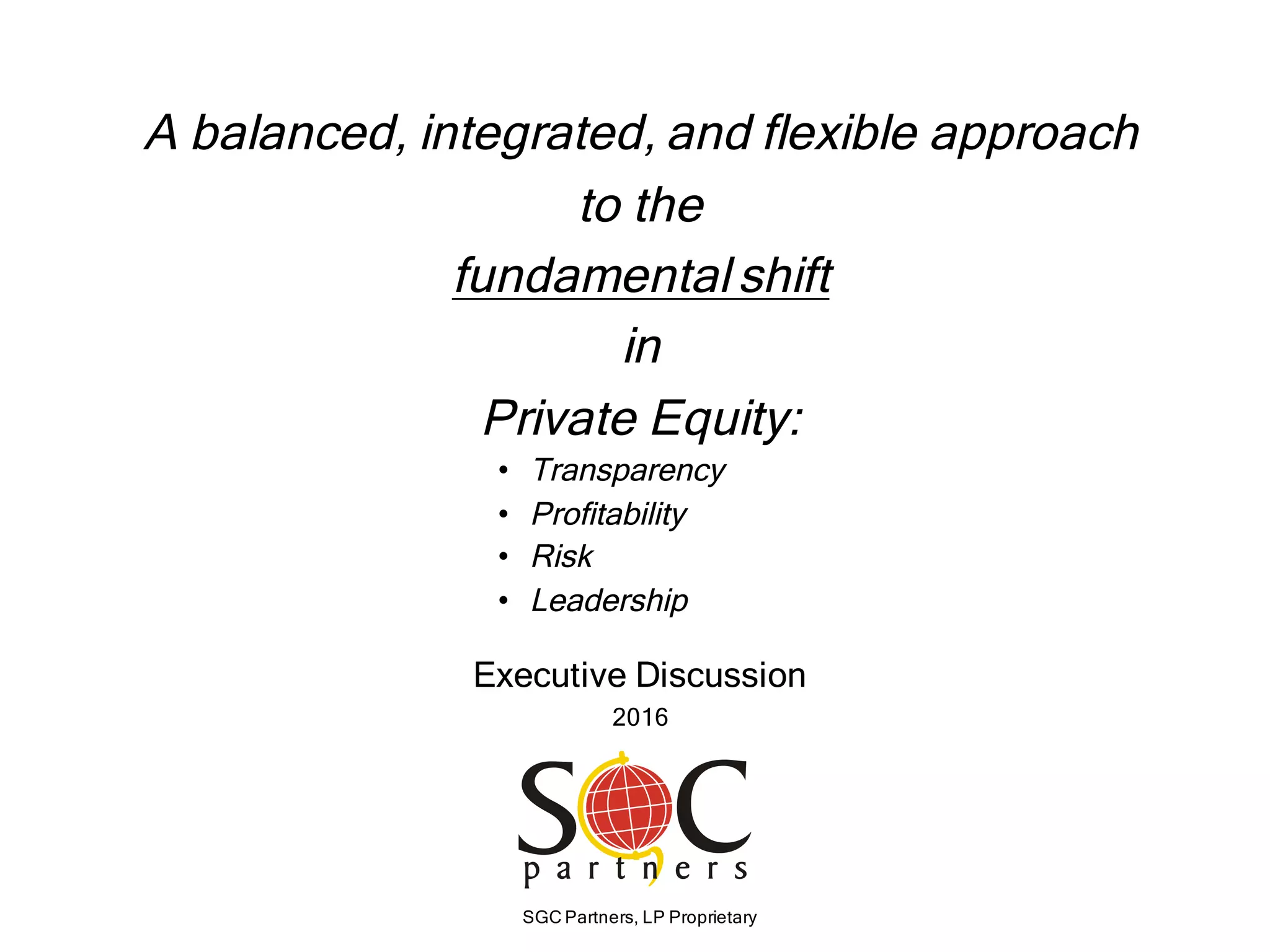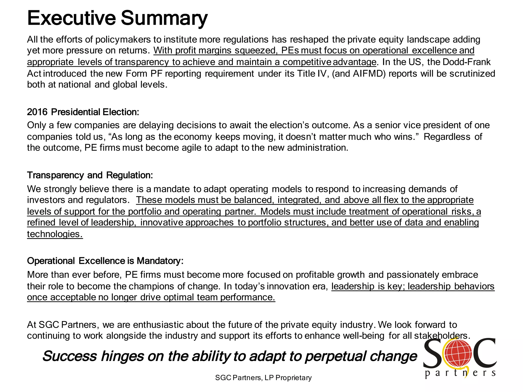 SGC Partners emphasizes the need for private equity firms to adapt to increasing transparency and regulatory demands while focusing on operational excellence to maintain competitive advantage. Key recommendations include a balanced approach to risk management, optimized leadership structures, and a data-centered asset lifecycle strategy. The document outlines major trends in 2016 affecting private equity, particularly regarding tax reform and capital availability as influenced by the presidential election.
