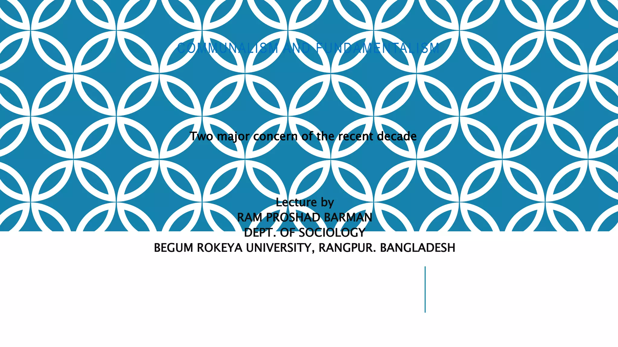 This document discusses communalism and fundamentalism. It defines fundamentalism as embracing a central religious text as infallible and taking religious tenets so seriously that evidence cannot dissuade one's views. Fundamentalism often arises from fear of change, modernization, and loss of influence. The document outlines different types of fundamentalism like Islamic, Christian, and Hindu fundamentalism and their effects like spreading terrorism and violence. Common traits of fundamentalist groups are basing beliefs strictly on revealed texts, rejecting other beliefs, and fearing education, media, and an uncertain future.