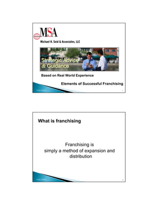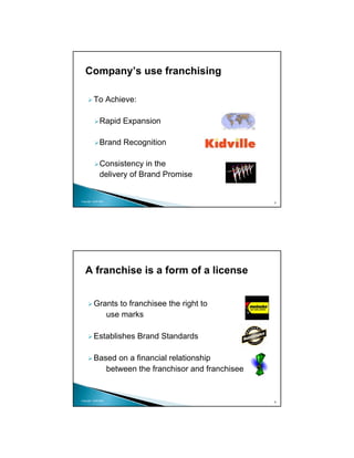The document discusses different elements of franchising, including definitions of franchising and the different types of franchise relationships. Franchising is a method for companies to achieve rapid expansion, brand recognition, and consistent brand delivery. There are two main types of franchises - product distribution franchises and business format franchises. The franchise relationship is based on a contract between the franchisor and franchisee that outlines their roles and responsibilities. Common ownership structures in franchising include single unit franchises, multi-unit/developer franchises, and master franchises.
