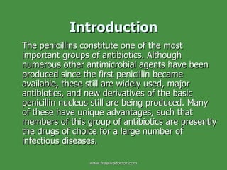 The document summarizes key information about penicillin, including its history of discovery, structure, mechanisms of action, resistance, pharmacokinetics, uses, and adverse effects. Penicillin was the first antibiotic discovered from mold and works by inhibiting bacterial cell wall synthesis. It binds to penicillin-binding proteins and inhibits the final transpeptidation step in peptidoglycan synthesis, disrupting cell wall formation.