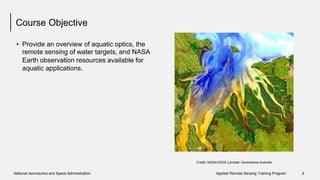 The document provides an overview of aquatic remote sensing, focusing on remote sensing principles, aquatic optics, and the various NASA satellite resources available for monitoring water quality and other aquatic parameters. It details the advantages of remote sensing, including synoptic coverage and the ability to observe remote locations, as well as the types of data products generated from satellite observations. Additionally, it discusses satellite capabilities, processing levels, and applications related to water quality assessment and ecosystem health.