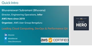 The document is a presentation by Bhuvaneswari Subramani on cloud computing and AWS, covering the fundamentals of cloud services, AWS core services, and the benefits of using AWS. It highlights the different cloud computing models (SaaS, PaaS, IaaS), the advantages of AWS including scalability and cost-efficiency, and provides insights on getting started with AWS through free tier options and educational resources. Additionally, it discusses AWS core services such as EC2, VPC, S3, RDS, and IAM along with best practices for security and resource management.