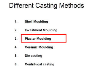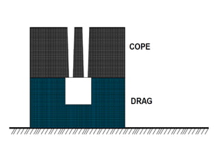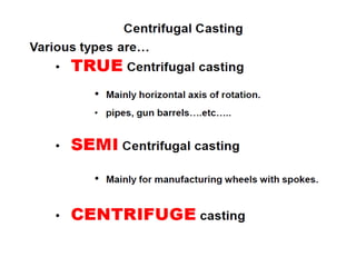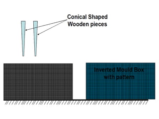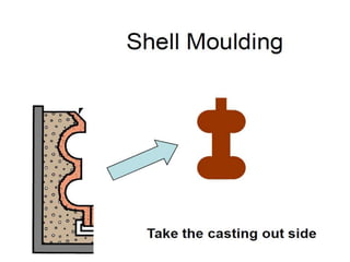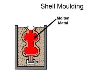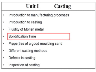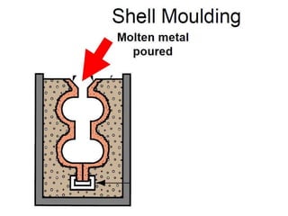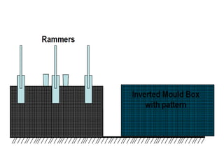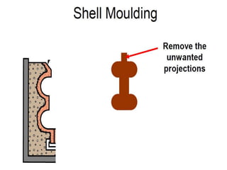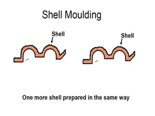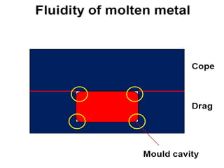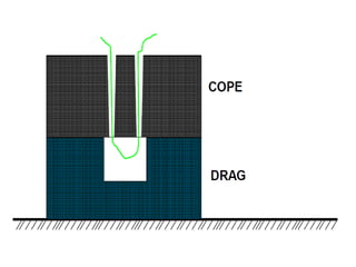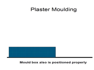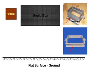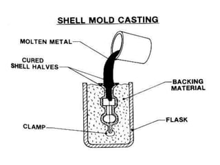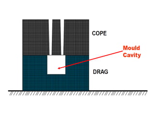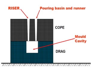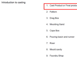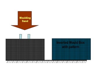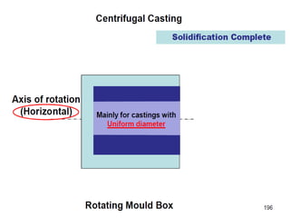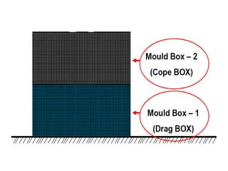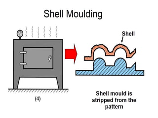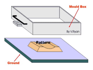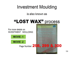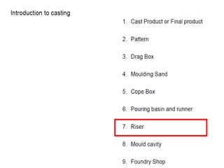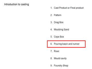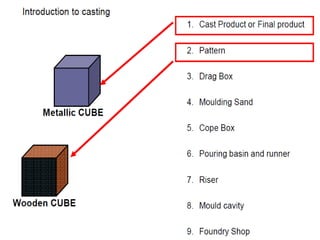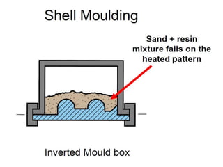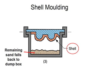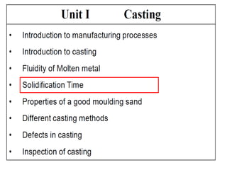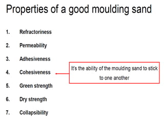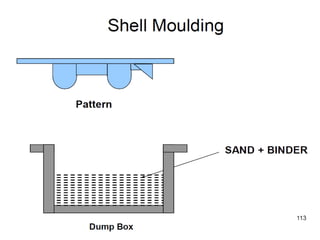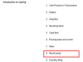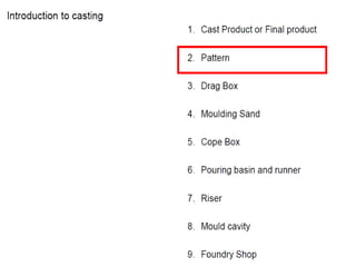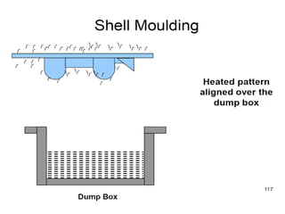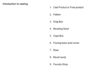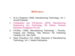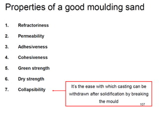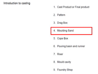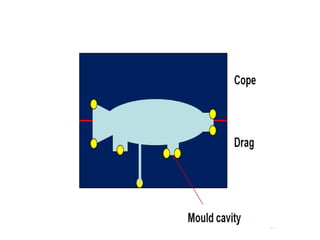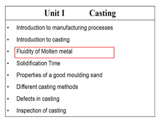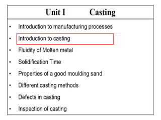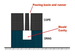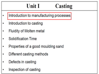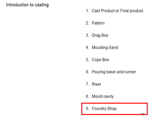 This document provides an overview of course material on fundamentals of manufacturing processes. It discusses various casting processes like sand casting, shell mold casting, investment casting, die casting, and centrifugal casting. Key steps and terminology related to sand casting like preparation of drag box and cope box are explained. Important properties of molding sand like permeability, refractory, and hot strength are also defined.
