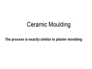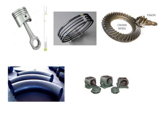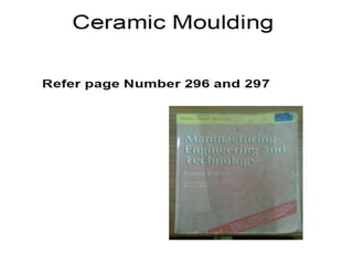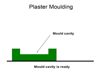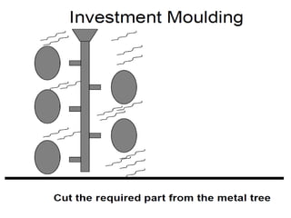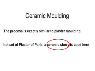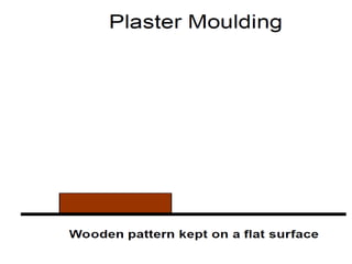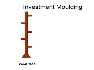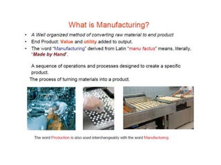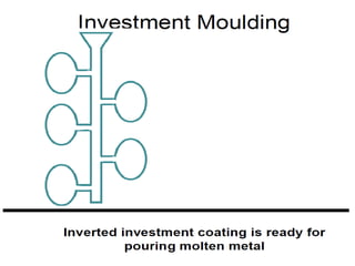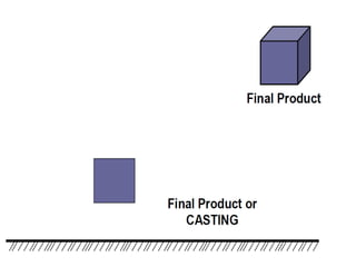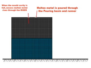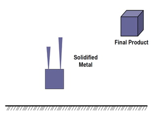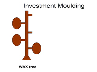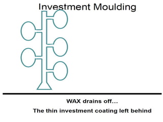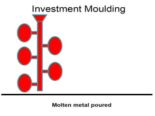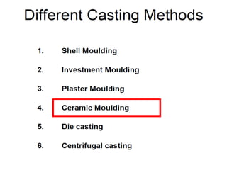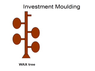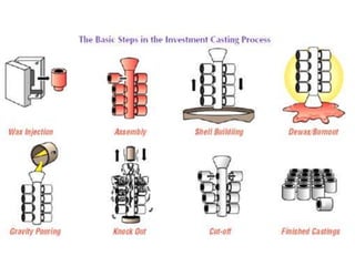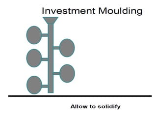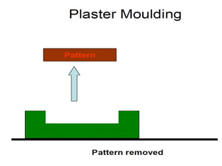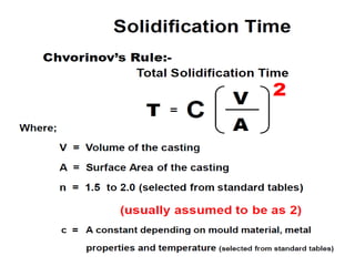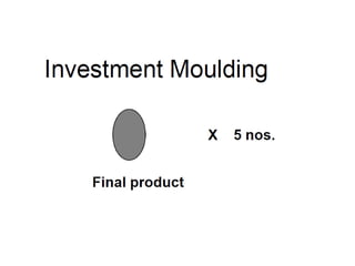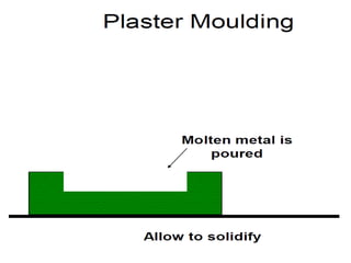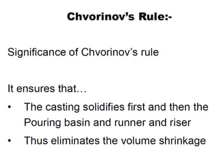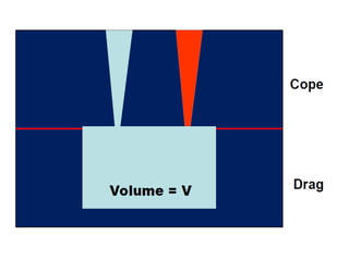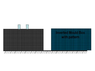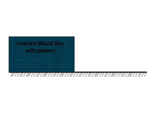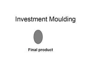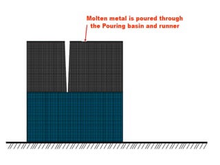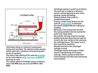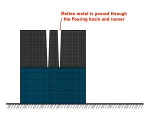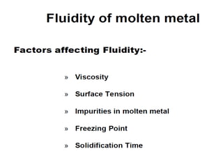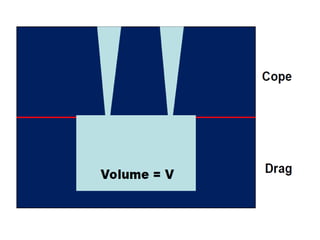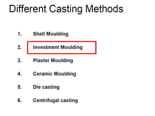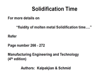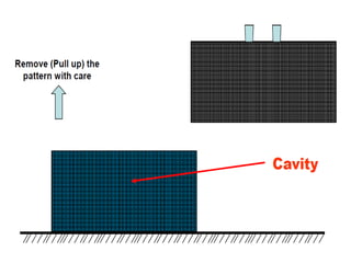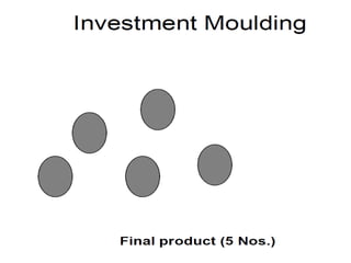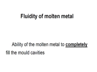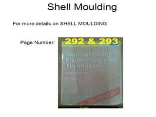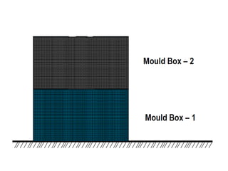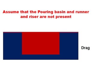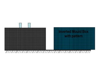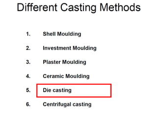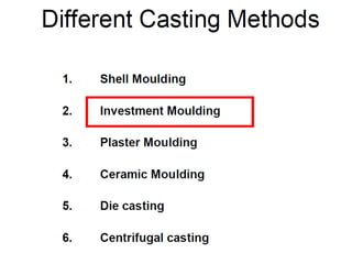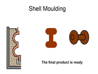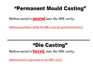 This document provides an overview of course material on fundamentals of manufacturing processes. It discusses various casting processes like sand casting, shell mold casting, investment casting, die casting, and centrifugal casting. Key steps and terminology related to sand casting like preparation of drag box and cope box are explained. Important properties of molding sand like permeability, refractory, and hot strength are also defined.