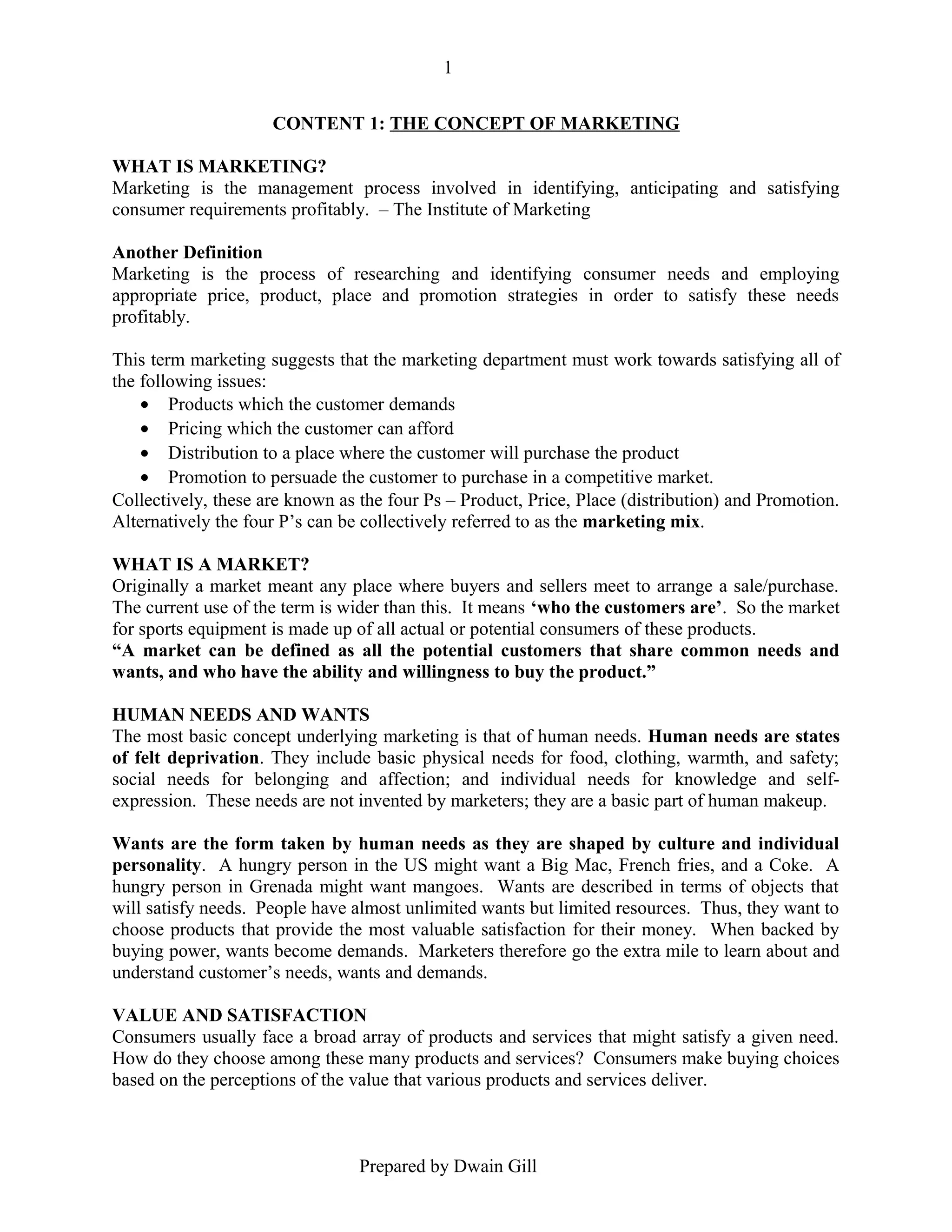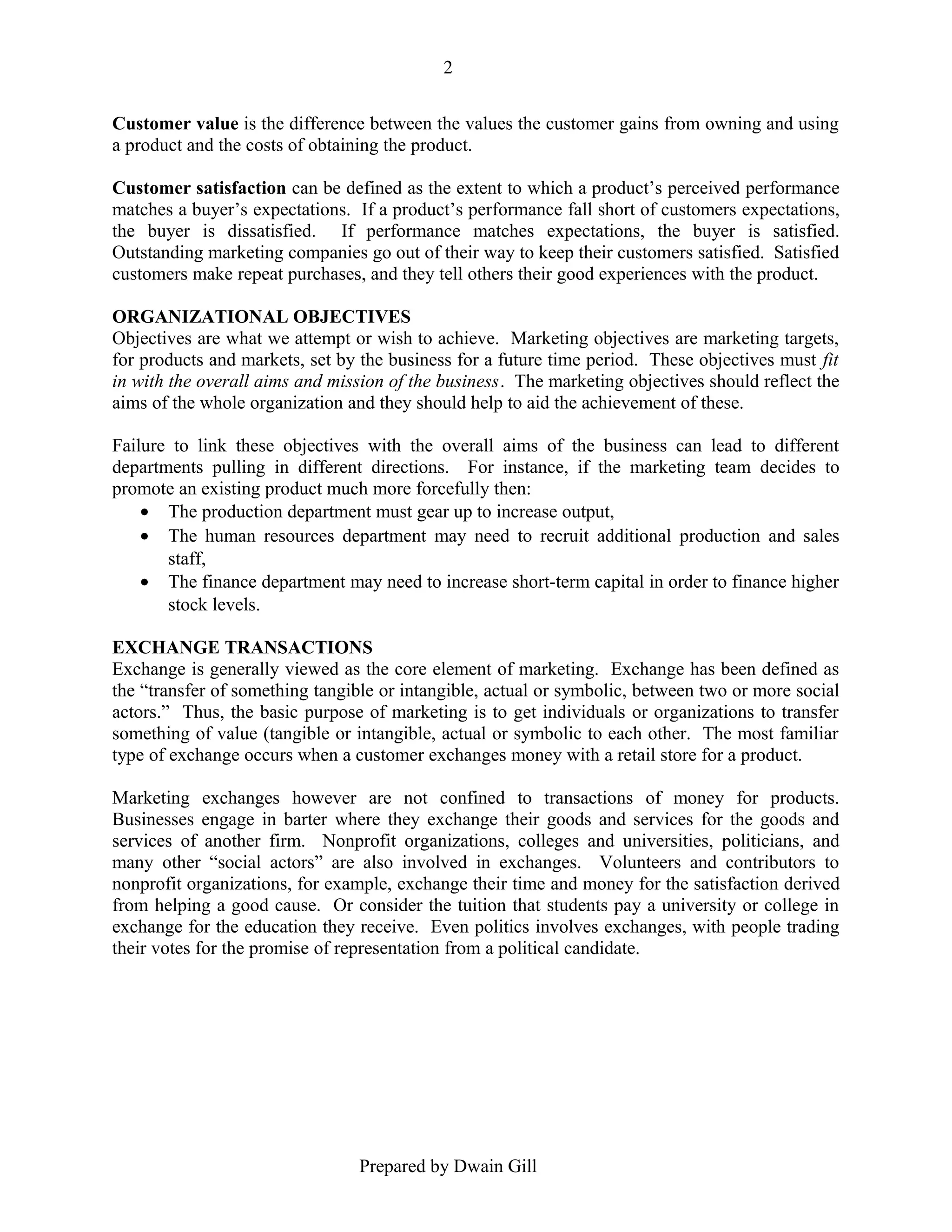 This document provides an overview of key marketing concepts. It defines marketing as identifying and satisfying consumer needs profitably through products, pricing, placement, and promotion. A market consists of potential customers with common needs. Marketing satisfies basic human needs and shaped wants. Customers seek value and satisfaction when choosing between products. Organizations set marketing objectives to align with overall aims. Exchange transactions transfer value between parties and are the core of marketing. The document also outlines different business concepts like production and marketing, and roles of marketing in society and the marketing management process.