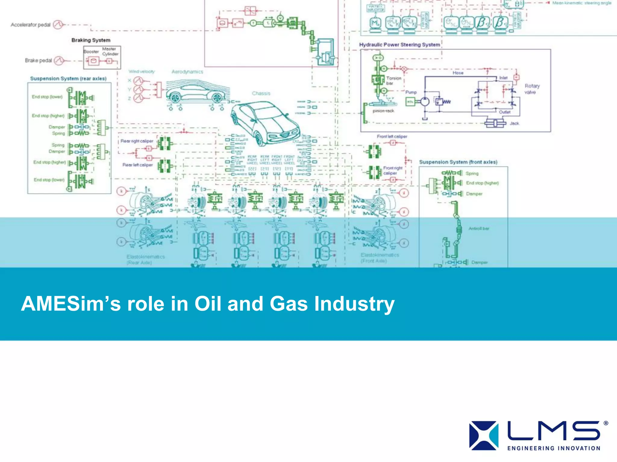 AMESim software can be used to simulate subsea oil and gas systems. It allows modeling of hydraulic power units, valves, actuators, accumulators, umbilicals, pipelines and other components. The software uses multi-domain modeling libraries to simulate dynamic behavior and optimize performance. System simulations can be run to analyze recovery time, emergency shutdown response and other scenarios. AMESim also enables closed-loop control system modeling and integration with other simulation tools.