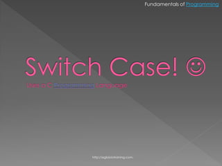 The document discusses switch case statements in C programming. It explains that switch case statements provide an alternative to long if-else statements by allowing a variable to be compared to multiple integer values. The program flow will continue at the case matching the variable's value. Break statements are used to exit each case block. A default case can handle any non-matching values. Examples are provided to demonstrate how switch case statements can be used to process user input and perform simple mathematical operations based on the input.