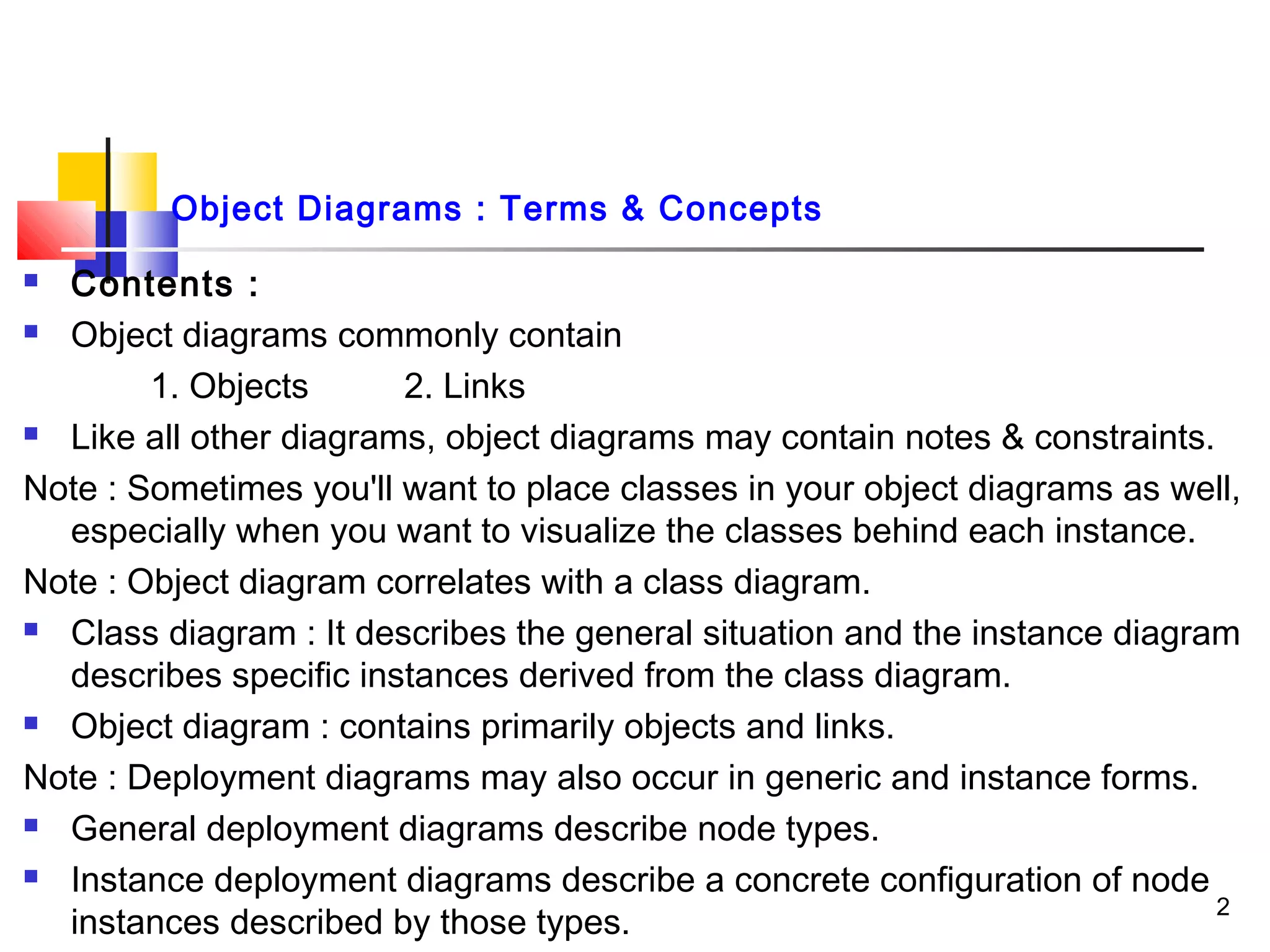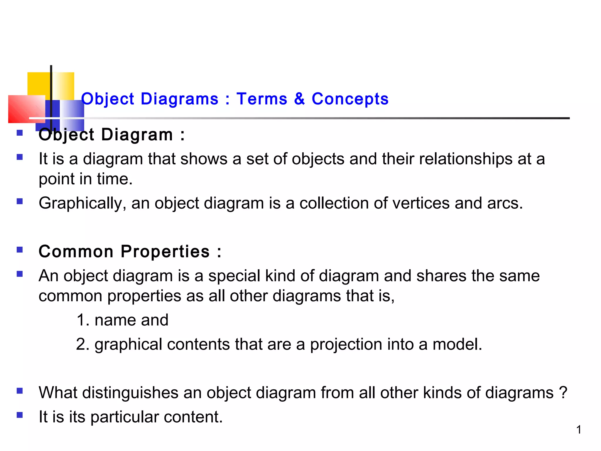 An object diagram is a visual representation of objects and their relationships at a specific moment, featuring objects, links, and potentially notes and constraints. It correlates with class diagrams, which describe generalities, while object diagrams focus on specific instances and states. Effective modeling includes identifying mechanisms, exposing relevant states and links, and ensuring clarity in communication while representing the system's static design view.