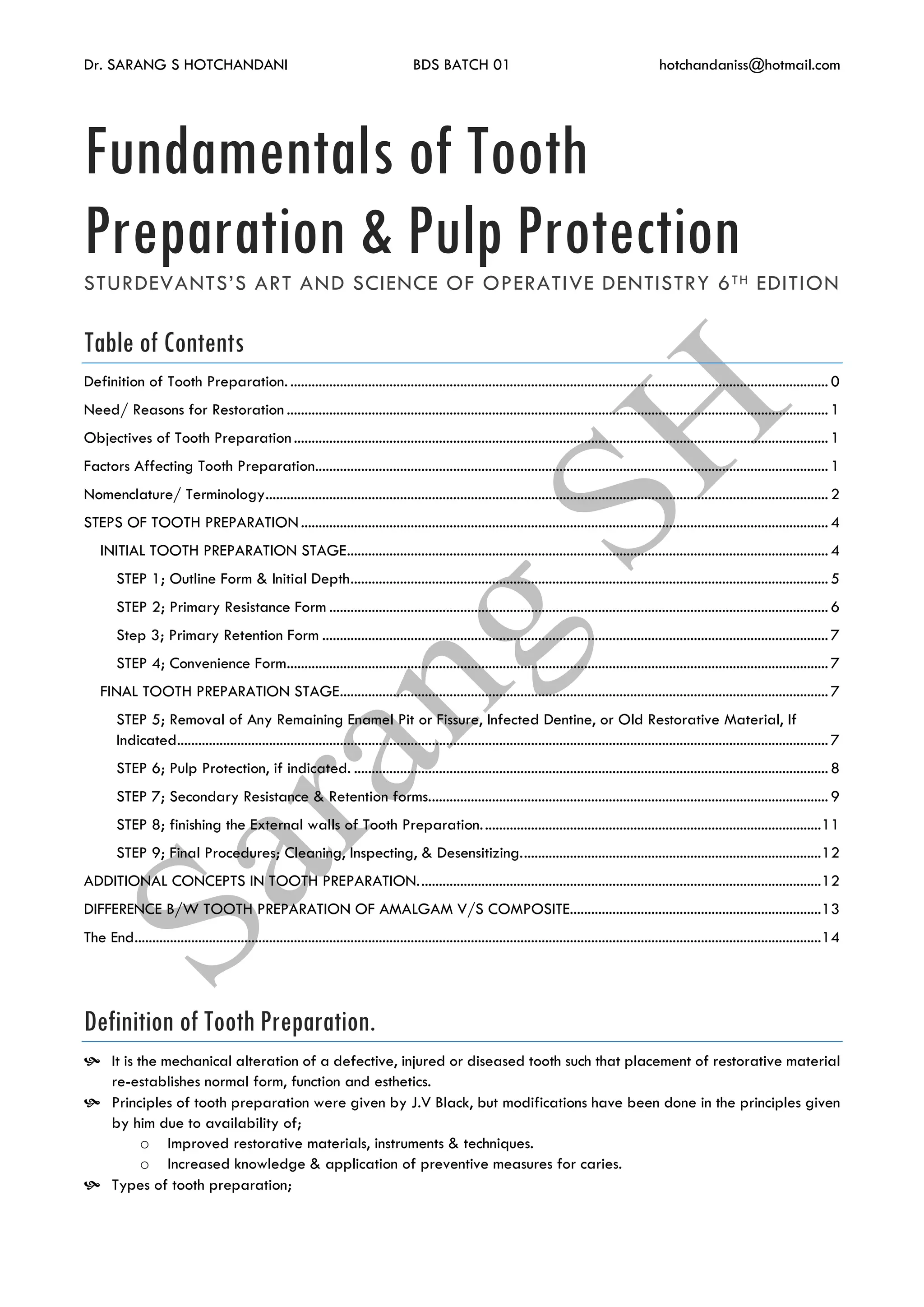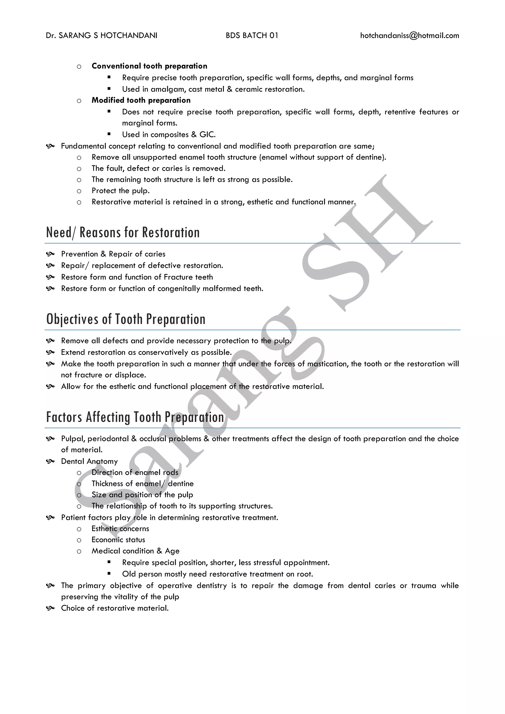The document outlines the fundamentals of tooth preparation and pulp protection in restorative dentistry, detailing the stages and principles involved in effective tooth preparation. It discusses the objectives, factors affecting preparation, types of restorations, and specific steps necessary for preparing a tooth, ensuring structural integrity and aesthetic considerations. Additionally, it contrasts conventional and modified tooth preparation, emphasizing the importance of preserving tooth vitality and adhering to modern practices in operative dentistry.