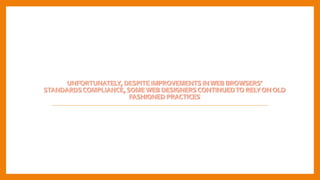 The document outlines the evolution of web design practices, emphasizing the importance of domain names, rendering engines, and browser compatibility. It details the shift towards web standards promoted by the Web Standards Project to ensure consistency across different browsers. Additionally, it discusses the role of HTML, CSS, and user interface tools in creating accessible and effective web pages.