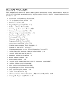 This document provides an overview of the practical applications covered in a textbook on electric circuits. It lists over 30 specific examples of applications, such as designing lighting systems, reading a voltmeter, modeling transducers, and calculating the number of stations allowable in an AM broadcast band. These applications are included to help students apply circuit concepts to real-life situations. The document also discusses computer tools like PSpice and MATLAB that are introduced in the textbook to allow circuit analysis.
