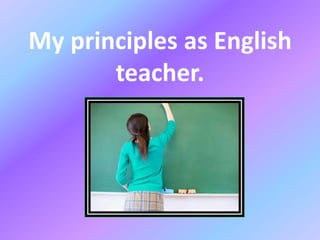 The document outlines the principles and role of an English teacher. It discusses how the teacher provides explanations to help students understand vocabulary and concepts. The teacher also provides examples and constructs knowledge together with students to check comprehension. Real-life situations are used to engage students and make the lessons relevant to their lives. The overall goal is to encourage critical thinking, problem solving and active participation through instruction adapted to diverse learners.