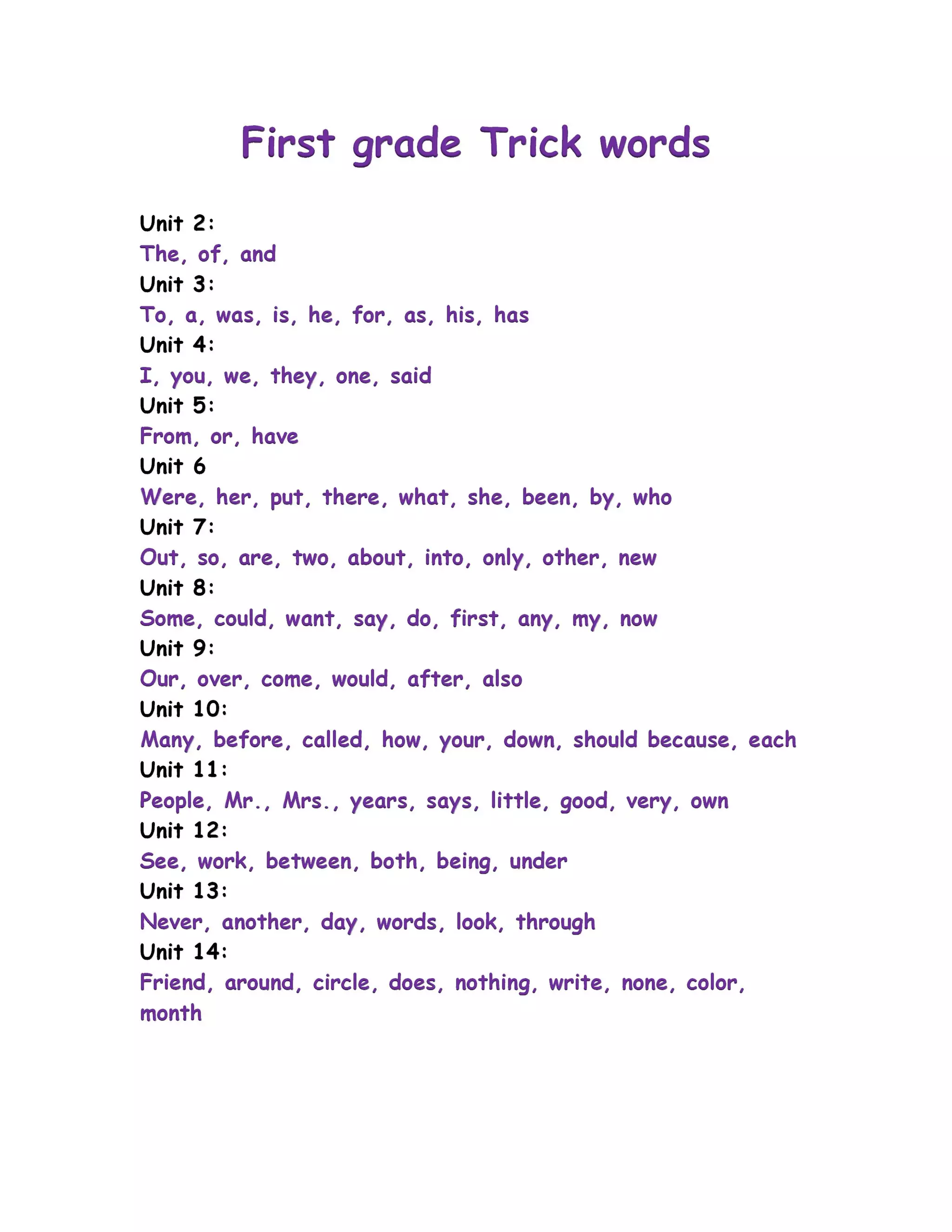 The document lists 14 units of commonly used "Trick words" or sight words for first grade students. Unit 1 contains the words "the", "of", and "and". The following units contain additional high frequency words including pronouns, prepositions, verbs, adjectives and other common words. The final unit contains words like "friend", "around", "circle", "does", and "nothing".