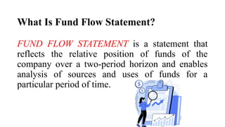 The document explains the concept and preparation of a fund flow statement, highlighting its importance in analyzing a company's financial position over two periods. It details definitions of funds, working capital, and distinguishes between current and non-current assets and liabilities, along with the process of creating the statement which includes understanding changes in working capital and recording various transactions. Additionally, it provides examples, including a practical case of preparing a fund flow statement based on balance sheets and other financial information for a company, ABC Ltd.