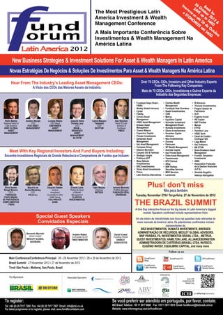 The document details an upcoming prestigious wealth management conference in Latin America, featuring over 70 leading CEOs, CIOs, and industry experts discussing investment strategies and market trends. The event will cover economic updates, regulatory impacts, and the future of asset management, along with networking opportunities for investors and fund buyers. The conference is set to take place on November 27-29, 2012, in São Paulo, Brazil.