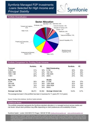 This document summarizes a portfolio managed by Symfonie Capital that invests in peer-to-peer loans selected for high income and principal stability. The portfolio contains 152 loans from the Funding Circle platform with an average yield of 10.8%, average maturity of 3.3 years, and average rating of B-. The majority of loans are rated C, with 18.5% rated A and 21.8% rated B. The portfolio is more diversified than the average Funding Circle loan universe based on borrower metrics like revenue size and debt levels.