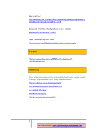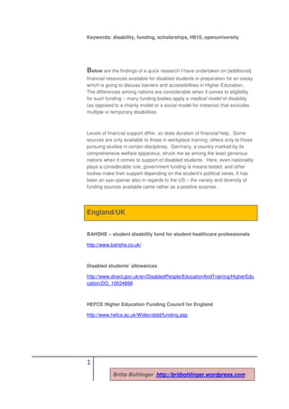 The document reviews various financial resources for disabled students across different nations, highlighting disparities in eligibility and support levels. It emphasizes that many funding opportunities are linked to specific disabilities and can vary significantly by country, with Germany being one of the least supportive. The author notes a positive surprise regarding the diversity of funding sources in the US and mentions several specific resources available in the UK, Ireland, Germany, and the US.