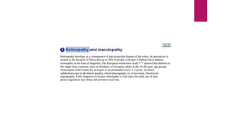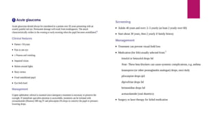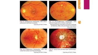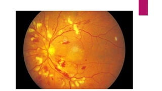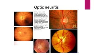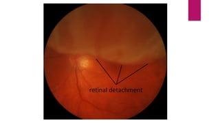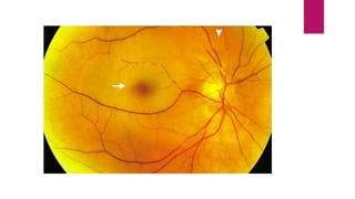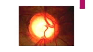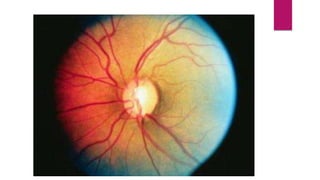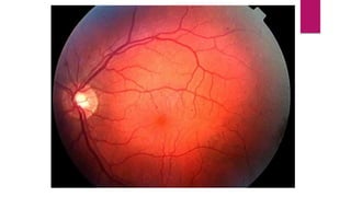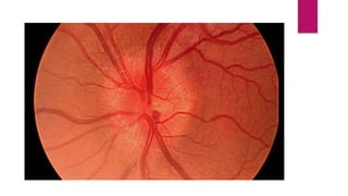 This document summarizes various funduscopic findings for different eye conditions. A normal fundus has a clear optic disc, red/orange retina with a dark macula, and bright red arteries and slightly purple veins. Papilledema shows swelling of the optic disc with blurred margins and engorged tortuous vessels. Retinal detachment appears as a gray retinal elevation with folded detached retina and tortuous elevated vessels. Optic neuritis presents as an elevated disc with blurred margins and normal retina and veins and attenuated arteries. Glaucoma shows cupping of the disc with displaced peripheral vessels and a pale cup. Central retinal vein occlusion fully obscures the disc due to edema and hemorrhages with blot retinal hemorrhages throughout