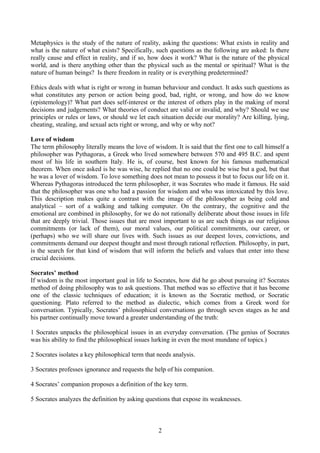 The document outlines a course on fundamentals of philosophy to be taught in Hong Kong in spring 2004, including the instructor's contact information and an overview of the first three lecture topics - an introduction to what philosophy is, Socrates' method of questioning to pursue wisdom, and the three basic laws of thought in logic. It provides background on the course and previews the key concepts and approaches that will be covered.