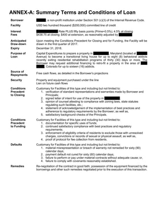 The document outlines a request for a $200,000 line of credit to establish a non-profit welfare agency, focusing on providing transitional housing for adults recovering from behavioral addictions. It details the financial terms, repayment plans, and therapeutic goals of the program, which aims to support individuals after in-house rehab with structured therapies and a supportive environment. The agency intends to conduct seminars for family support and improve housing services in a niche market that lacks adequate recovery resources.