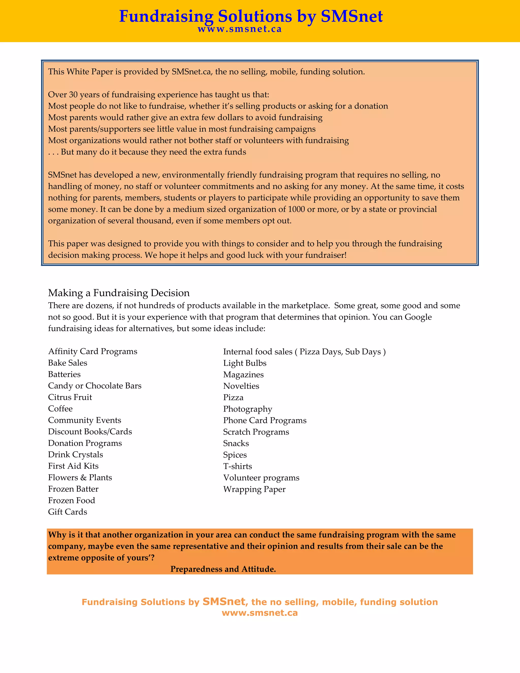 This document provides information and guidance for organizations on fundraising strategies and solutions. It discusses that most people dislike fundraising activities that involve selling products or directly asking for donations. It then introduces SMSnet as a no-selling mobile funding solution. The document goes on to provide tips and considerations for organizations in making fundraising decisions, including developing a wish list, setting goals, timing, and planning strategies. It also discusses and compares different types of popular fundraising programs and product sales.
