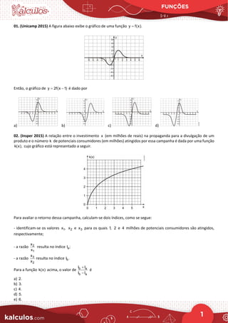 This document contains 19 multiple choice questions about functions. The questions cover topics such as function graphs, polynomial functions, logarithmic functions, and inequalities involving functions. For each question there are 5 possible answer choices labeled a-e. The answers given are: 1) B 2) C 3) D 4) D 5) D 6) A 7) C 8) E 9) B 10) C 11) A 12) C 13) B 14) C 15) D 16) D 17) A 18) B 19) C.