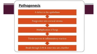 This document discusses fungal keratitis, including its pathogenesis, classification, predisposing factors, clinical features, investigations, treatment, and recent advances. Some key points: