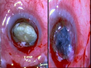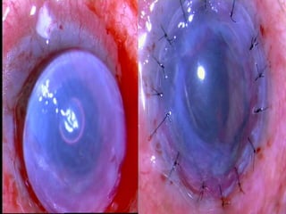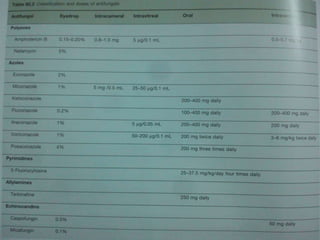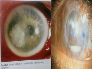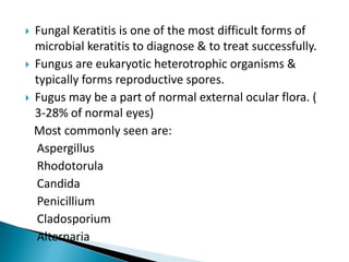 Fungal keratitis is difficult to diagnose and treat. Common causative fungi include Aspergillus, Candida, and Fusarium. Diagnosis involves potassium hydroxide wet mount, stains like Gram or Grocott's, and culture. Topical natamycin is first-line treatment but systemic antifungals like voriconazole may be needed for severe cases. Management also includes frequent debridement and potentially therapeutic penetrating keratoplasty for non-responsive or advanced cases. Prognosis depends on factors like ulcer size and presence of hypopyon.