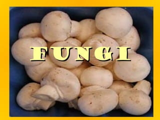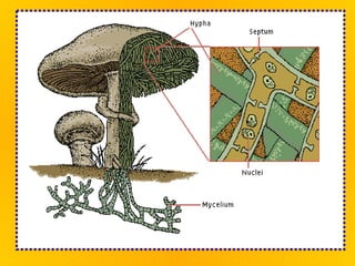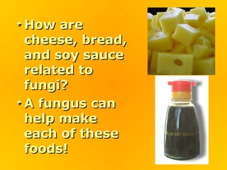 Fungi play an important role in food production. Yeast, a type of fungus, is used to make bread and alcoholic beverages. Other fungi are used to produce cheeses and soy sauce. Fungi have rigid cell walls and feed by absorbing nutrients from dead or living matter. They reproduce both sexually through spores and asexually through hyphae and spores. Major groups of fungi include molds, yeasts, mushrooms, and lichens, which combine fungi and algae.
