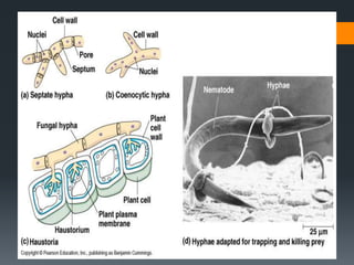 This document provides an overview of fungi. It discusses that fungi are eukaryotic organisms classified in the kingdom Fungi. They can exist as molds, yeasts, or dimorphic fungi. Fungi have cell walls containing chitin and reproduce asexually through spores or budding or sexually through the fusion of hyphae. The document outlines the morphological characteristics, differences from bacteria, classification systems based on cell structure and reproduction, and types of fungal infections like superficial, cutaneous, subcutaneous, and systemic mycoses.
