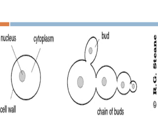 The document provides an overview of fungi as a kingdom within the five-kingdom system of life, detailing their characteristics, classifications (yeasts, molds, and macroscopic fungi), and reproductive methods. Fungi are eukaryotic organisms that lack chlorophyll, obtain nutrients through absorption, and play a crucial role in decomposition. It also discusses their structural components, growth requirements, and ecological significance, highlighting their role in human and plant diseases.