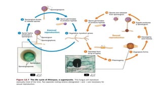 Fungi are a diverse group of eukaryotic organisms separate from plants and animals, with over 100 thousand identified species, 200 of which are pathogenic. They can exist in multicellular forms (molds) or unicellular forms (yeasts), and reproduce through both asexual and sexual means, producing various types of spores. Fungi play significant ecological roles as decomposers and have considerable economic importance in food production and pharmaceuticals, alongside harmful effects like mycoses, which are chronic fungal infections.