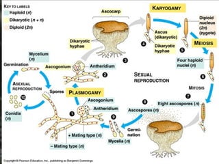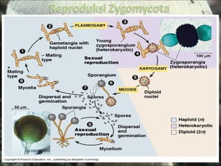 Dokumen tersebut membahas tentang fungi (jamur) yang termasuk ke dalam kingdom fungi. Fungi memiliki ciri khas berupa tubuh yang terdiri dari hifa dan miselium, tidak memiliki klorofil, dan hidup secara heterotrof. Fungi diklasifikasikan ke dalam empat divisi berdasarkan cara reproduksi seksualnya, yaitu Zygomycota, Ascomycota, Basidiomycota, dan Deuteromycota. Masing-masing divisi memiliki ciri khas