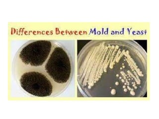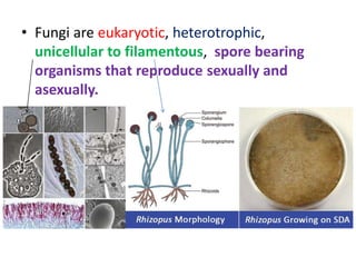 Fungi are eukaryotic organisms that can exist as unicellular yeasts or multicellular molds and mushrooms. They have rigid cell walls made of chitin and reproduce both sexually through spores and asexually through budding or fragmentation. Yeasts are unicellular while molds are filamentous and made up of branching hyphae. Fungi play important roles in industries like food production as well as in biodegradation and antibiotic production. Medically important fungi are classified into four divisions: Ascomycetes, Basidiomycetes, Zygomycetes, and Deuteromycetes.