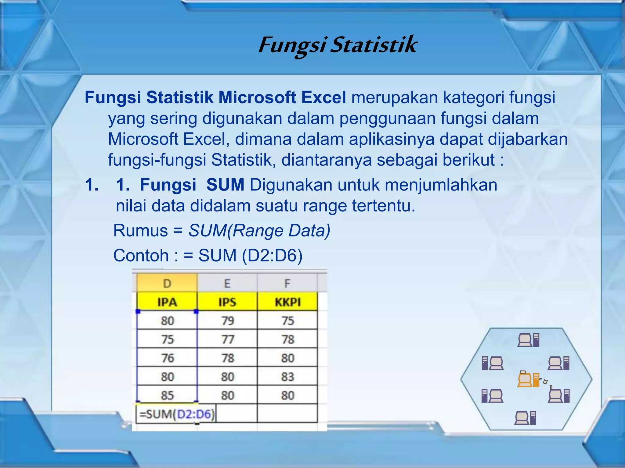 Dokumen ini menjelaskan berbagai fungsi statistik yang tersedia di Microsoft Excel, termasuk SUM, AVERAGE, MAX, MIN, COUNT, dan fungsinya masing-masing beserta contoh penggunaannya. Beberapa fungsi lain yang dibahas adalah COUNTIF, COUNTBLANK, STDEV, VLOOKUP, HLOOKUP, PERCENTRANK, QUARTILE, RANK, PERCENTILE, CONFIDENCE, dan EXPON. Dokumen ini bertujuan untuk memberikan pemahaman dasar tentang penggunaan fungsi statistik dalam Excel.