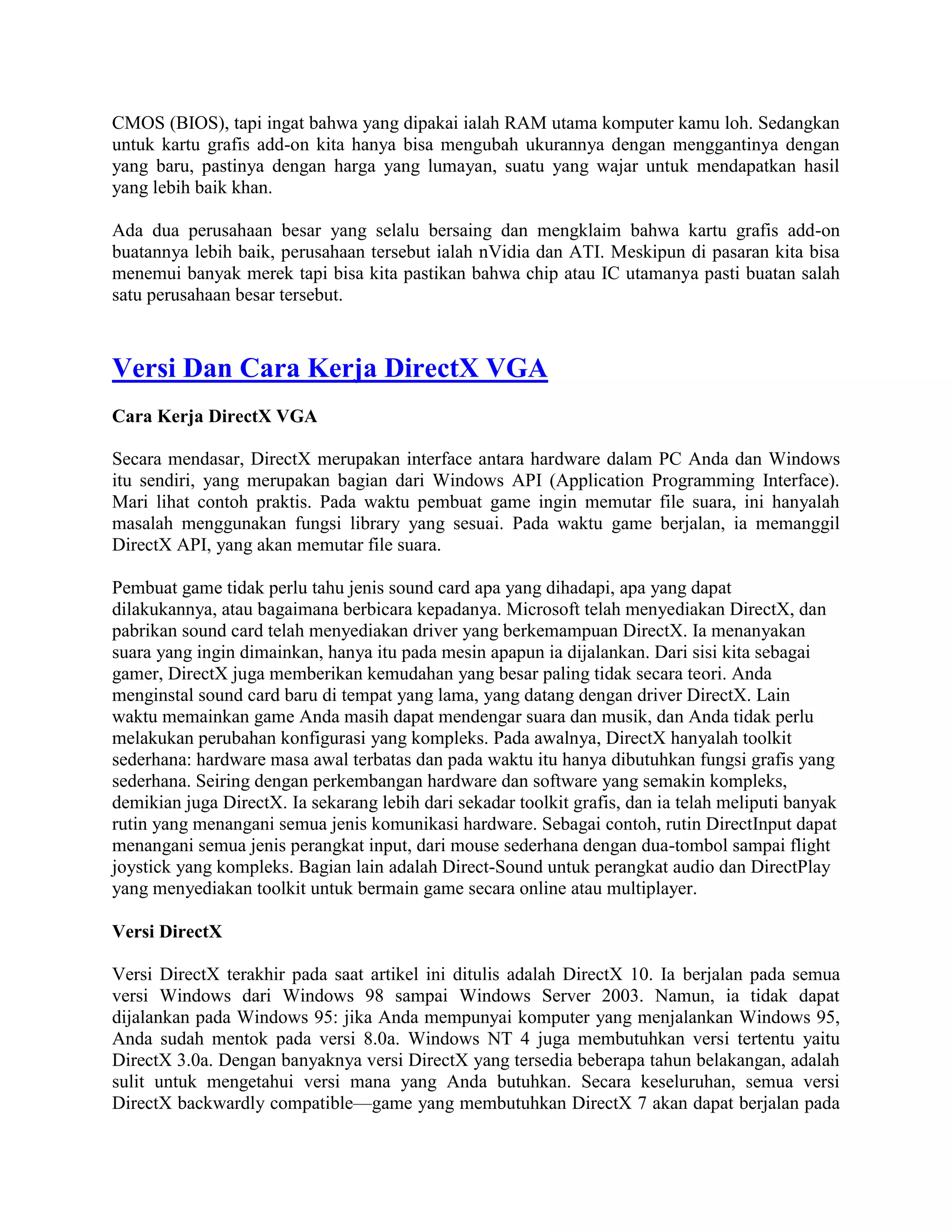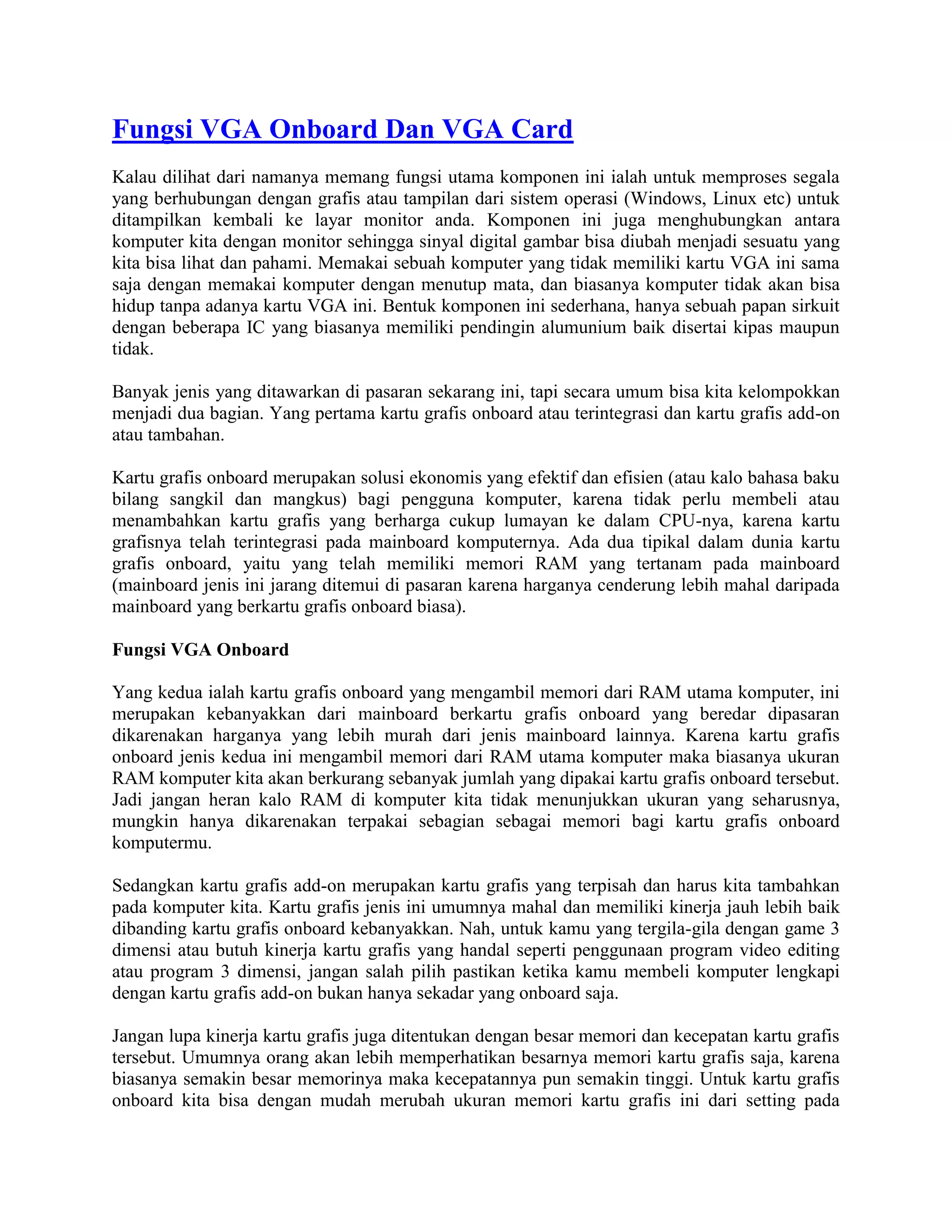 Dokumen ini membahas perbedaan antara kartu grafis onboard dan add-on, serta menjelaskan konsep DirectX sebagai interface antara hardware dan sistem operasi. Kartu grafis onboard terintegrasi pada mainboard dan lebih ekonomis, sementara kartu grafis add-on terpisah dan memiliki kinerja lebih baik untuk aplikasi berat. Selain itu, dokumen juga menjelaskan bagian-bagian dari video card dan sejarah pengembangan DirectX serta pentingnya standar ini dalam mengatasi kompleksitas gaming pada PC.