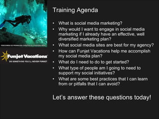 The document provides an overview of social media marketing for travel agencies. It discusses why agencies should engage in social media marketing and which social media sites are best. It outlines Funjet Vacations' strategy to help agencies grow through social media by acting as a lead generation resource and creating educational resources. The document also discusses best practices for social media use and the types of people needed to support social media efforts.