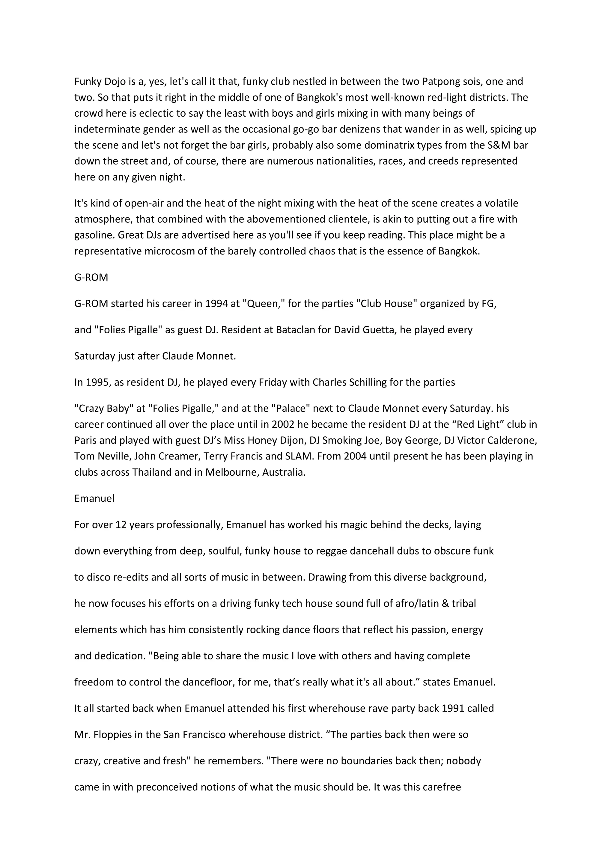 Funky Dojo is an eclectic club located in Bangkok's Patpong neighborhood, a red-light district known for its diversity. The club attracts a mixed crowd of men, women, and people of various gender identities from different backgrounds. With its open-air setting and lively atmosphere, Funky Dojo resembles the barely controlled chaos of Bangkok. The document then provides background on several DJs who play at the club, including G-ROMG-ROM, Emanuel, Fred Jungo, and DJ Saint-Vincent.